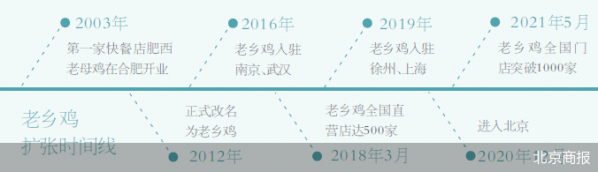 据了解,老乡鸡第一家快餐店肥西老母鸡2003年在合肥开业,2012年正式改名为老乡鸡。老乡鸡于2016年入驻南京、武汉,2019年入驻徐州、上海。目前,老乡鸡全国有1000多家快餐店,分布在深圳、杭州、扬州、北京等地。在去年12月进入北京市场,根据大众点评显示,目前老乡鸡在北京地区共有12家门店,其中有2家处于尚未开业状态。