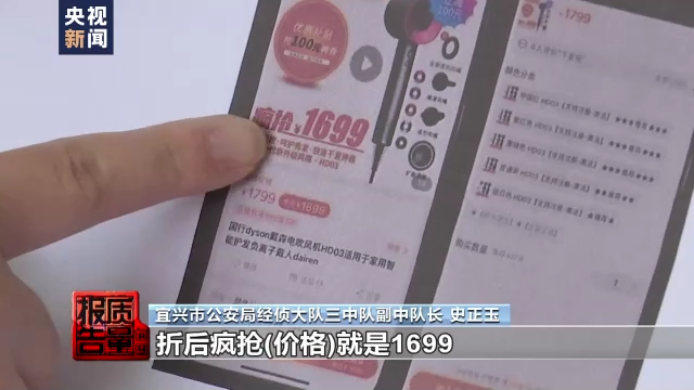 宜兴市公安局经侦大队三中队副中队长 史正玉:我们从这家淘宝店铺着手进行一个调查。这就是当时店铺的一个详情介绍,原价是1799,折后、疯抢(价格)就是1699,最终的这个价格就是1699。它后面有颜色分类,各种型号都有。这家店铺只卖吹风机这个产品,这个淘宝店铺注册是在2020年12月左右,一直到案发今年的3月份,从店铺销量看,大概有1000多件。
