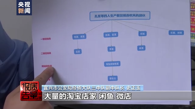 宜兴市公安局经侦大队三中队副中队长 史正玉:最上游就是以孔某等4人生产假冒吹风机并且销售的一个团伙,孔某的下游,也就是一级经销商查下来有4个,在广州市、东莞市、韶关市和深圳市;二级经销商发现有3个,在东莞市、深圳市、陕西的汉中市;再下一级,网络的销售商,大量的淘宝店家,闲鱼、微店,最后一级就是大量的消费者,就是购买到假冒吹风机的(消费者)。