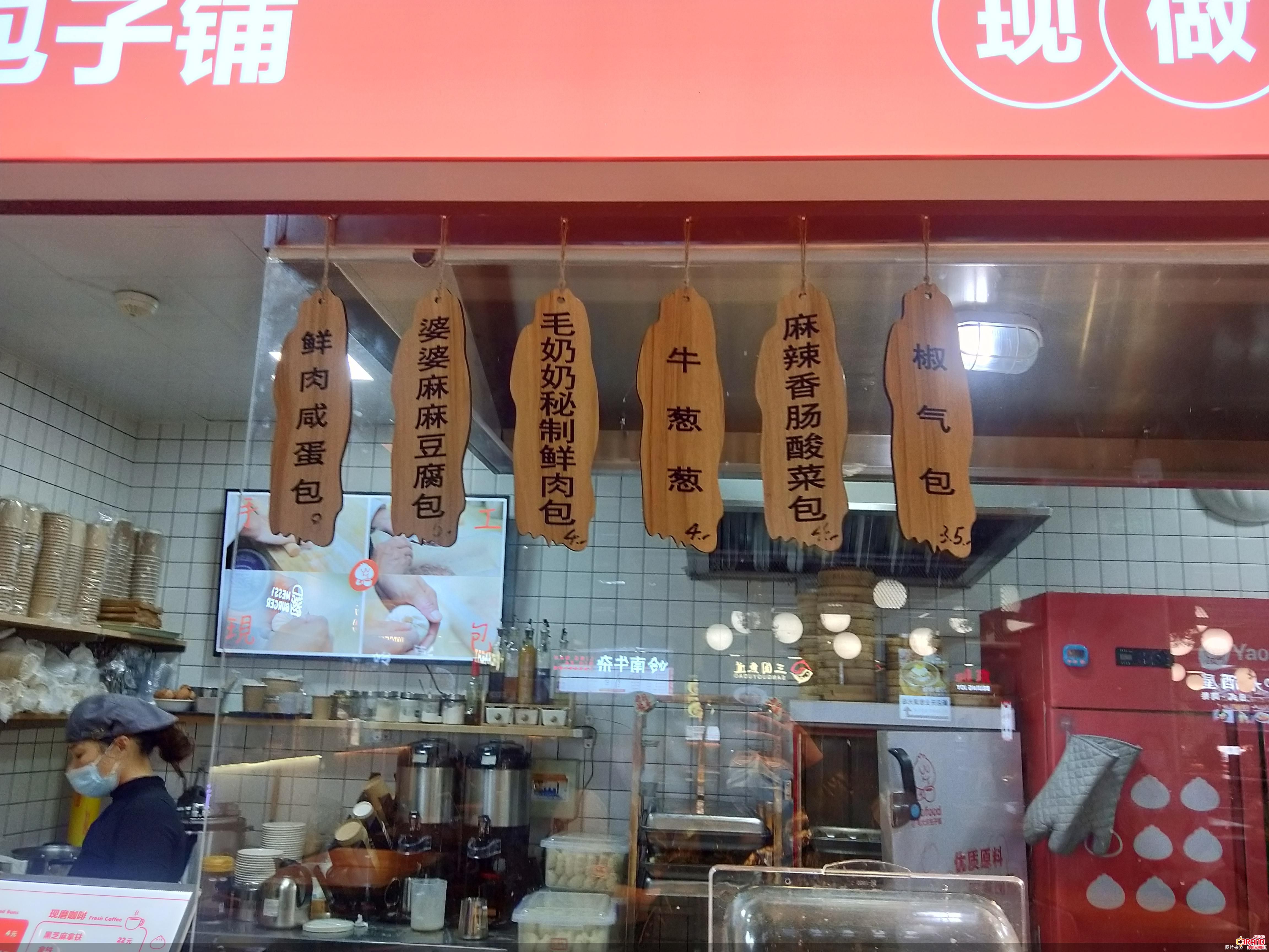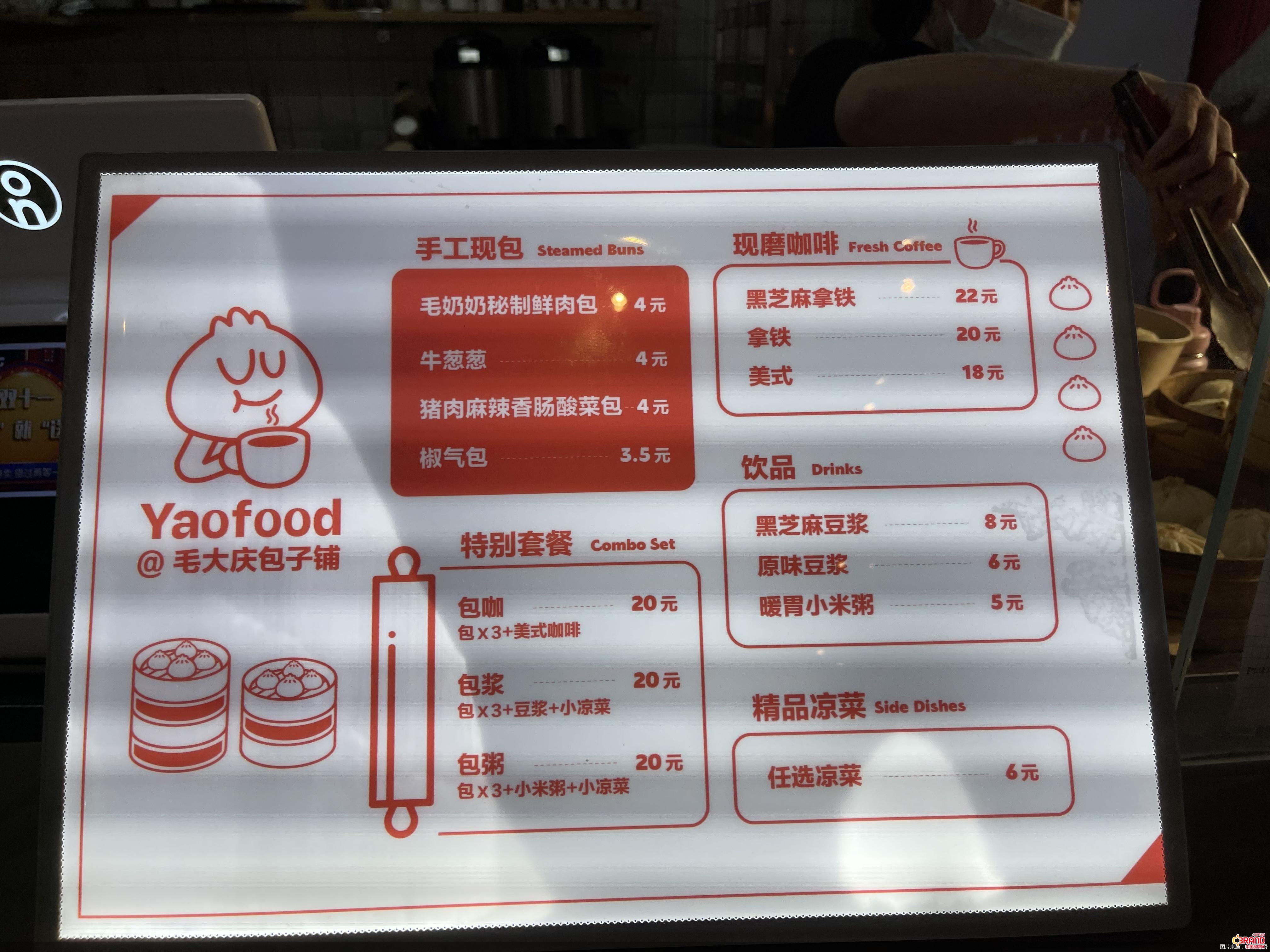 走访位于国贸的无限空间美食花园时,北京商报记者发现一家名为“毛大庆包子铺”的门店。从现场看到,菜单显示手工现包系列有4款包子,但门头下悬挂着6个木制牌子,标注着鲜肉咸蛋包、婆婆麻麻豆腐包、毛奶奶秘制鲜肉包等6款包子产品,售价区间在3.5-8元/个。