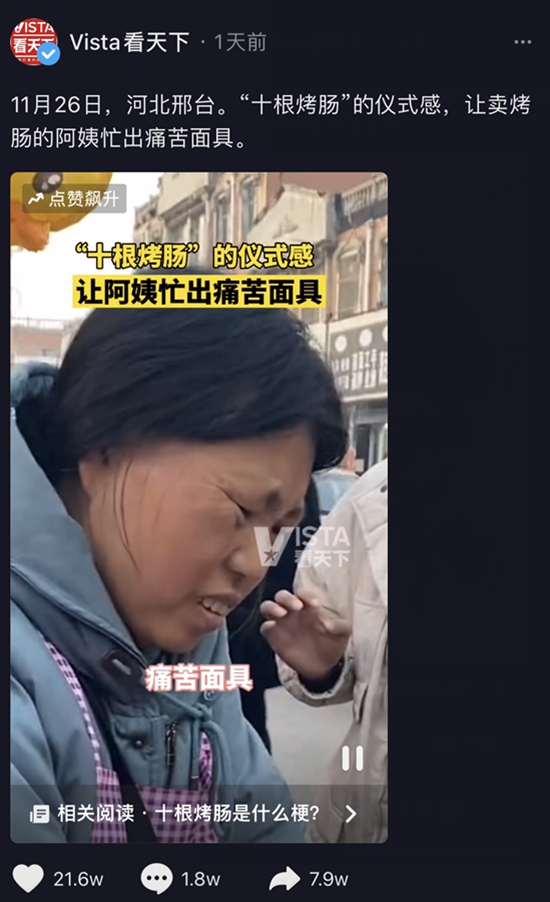 在“10根烤肠”火了以后,一个卖烤肠阿姨也火了,顾客每人都买10根烤肠,把烤肠摊围得水泄不通,阿姨手忙脚乱,表情“苦大仇深”,被网友调侃忙出“痛苦面具”。