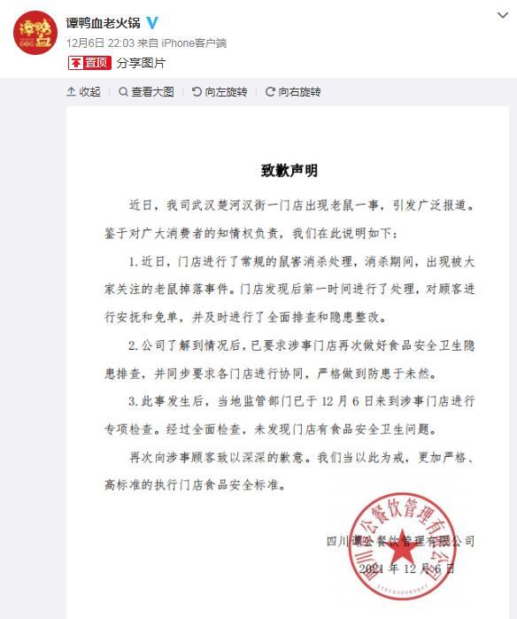 谭鸭血老火锅官方微博发布致歉声明,对其武汉楚河汉街一门店出现老鼠一事作出回应