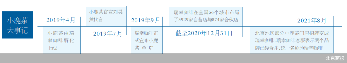 从2019年4月小鹿茶诞生到同年9月自成品牌“单飞”,再到如今,以另一种形式“回归”瑞幸咖啡之中,从品牌到品类,“小鹿茶”没有被放弃,并且在“瑞幸”这个行列里开始扮演重要角色。虽然目前小鹿茶App中已经搜索不到北京地区的小鹿茶门店,但多家瑞幸咖啡门店中都售卖备注着“小鹿茶”的茶饮系列。