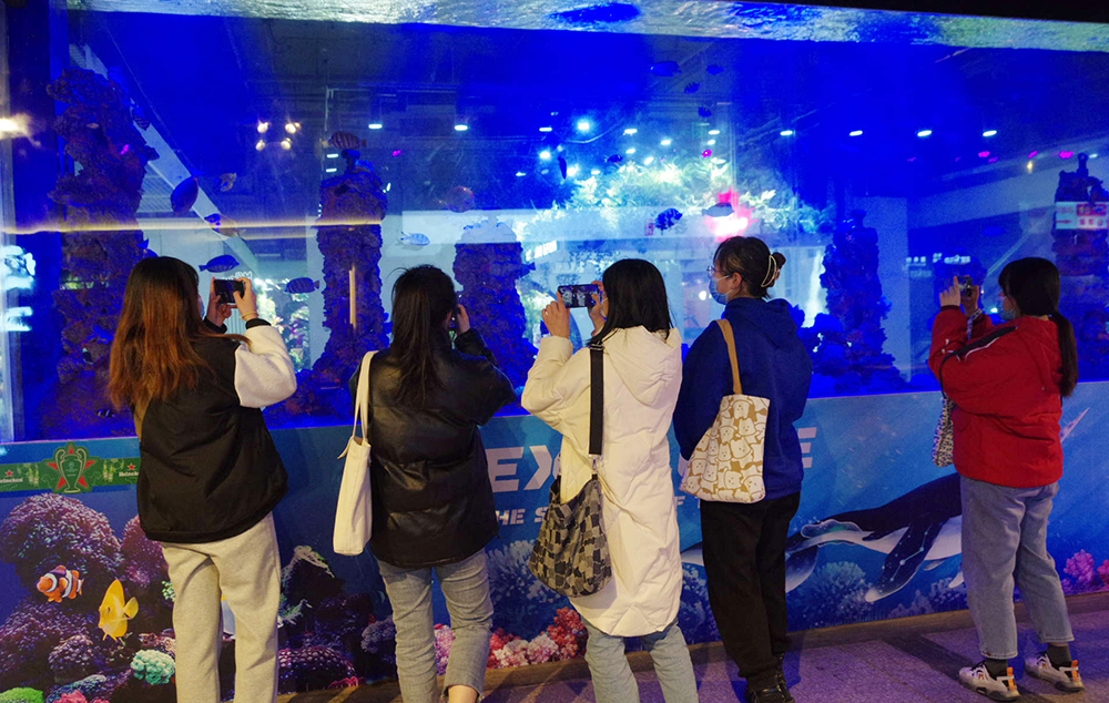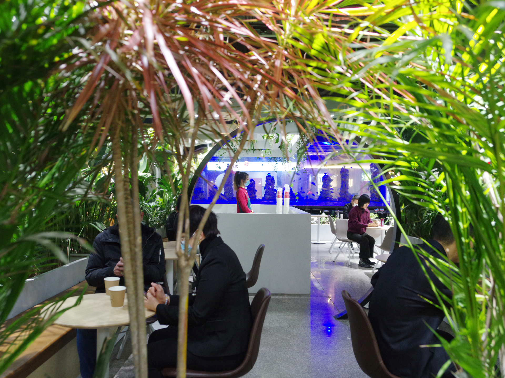 值得一提的是美食城内中央的水族箱,营造出犹如海洋博物馆般的氛围,透过明亮的水族箱,观看那湛蓝色的海水中游曳、玩耍、嬉戏的各种鱼儿,令人心旷神怡;空中还时不时地喷淋云雾,刹时间云山雾罩,在寒冷的冬季如沐春风,好开心!