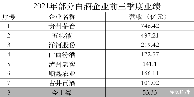 从三季报来看,贵州茅台、五粮液、洋河股份、山西汾酒、泸州老窖、顺鑫农业、古井贡酒营收均成功迈入“百亿俱乐部”。具体来看,上述7家企业实现营收分别为746.42亿元、497.21亿元、219.42亿元、172.57亿元、141.1亿元、116.11亿元和101.02亿元。而排名第8位的今世缘,今年前三季度营收仅为53.33亿元。