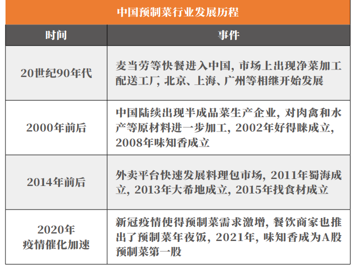 预制菜不是一个新概念,早在90年代,麦当劳等快餐店进入中国,国内出现净菜配送加工厂。2000年前后,中国陆续出现半成品菜生产企业,2014年前后,预制菜行业在B端步入放量期。2020年至今,预制菜在C端市场迎来小爆发。