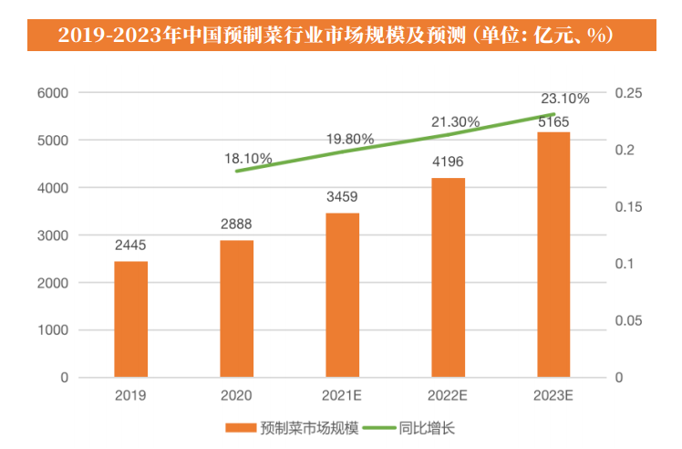 艾媒咨询数据显示,2021年,中国预制菜市场规模预估为3459亿元,同比2020年增长19.80%。预计未来中国预制菜市场保持20%左右的增长率高速增长,2023年市场规模将达5165亿,潜力巨大。