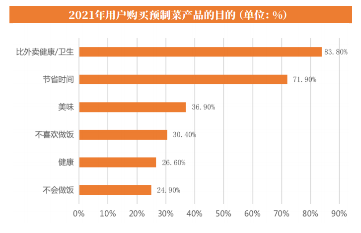 艾媒咨询调研数据显示,比外卖健康/卫生、节省时间是用户购买预制菜的主要目的,其次是美味和不喜欢做饭。凭借着简单方便的烹饪方式,丰富多样的菜品选择,预制菜满足了当代年轻人“懒宅馋”场景下的用餐需求。