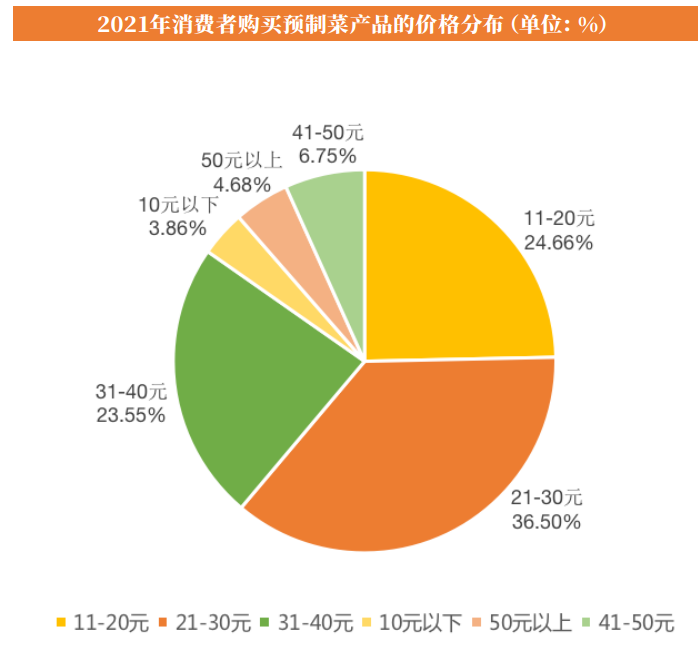 《2021年中国预制菜行业分析报告》显示,消费者购买的预制菜的价格分布主要集中在21-30元这个区间,占比为36.50%,其次为11-20元,占比为24.66%。此外,消费者主要在线下渠道购买预制菜,占比达78.5%。