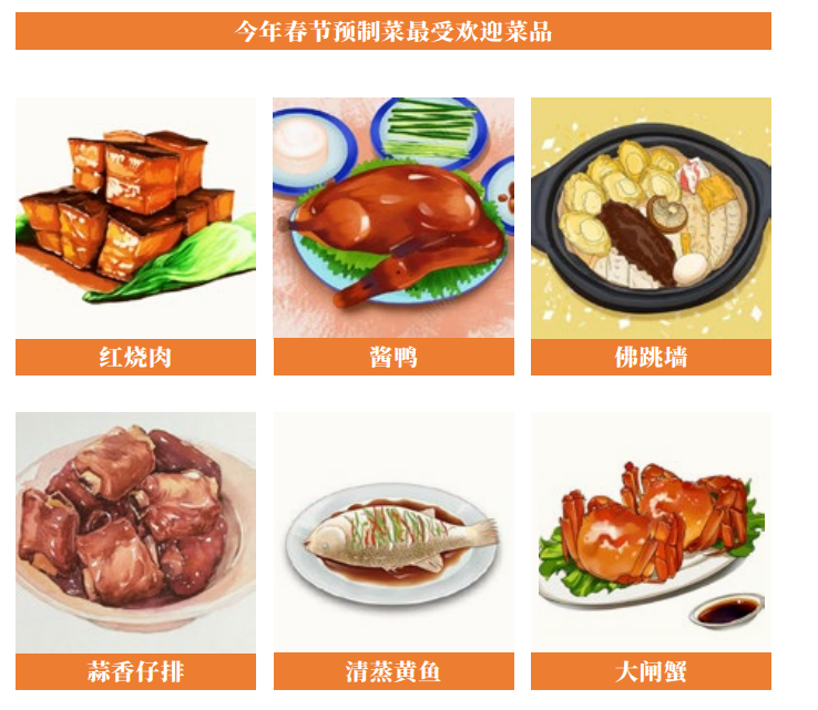 《2022年淘宝年夜饭报告》显示,今年春节,预制菜销量再次上涨,同比去年增长超100%,成为年夜饭最火菜式之一。调查显示,在年夜饭餐桌上,红烧肉、酱鸭、佛跳墙、清蒸黄鱼、蒜香仔排、大闸蟹等肉菜类预制菜最受欢迎。