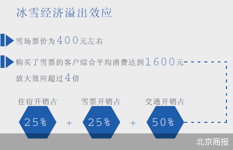 去哪儿大数据研究院曾发布数据显示,冰雪游收入每增加1元,可带动交通、住宿、餐饮等相关行业增收超过4元。以北大湖雪场为例,雪场票价为400元左右,去哪儿数据显示,购买了北大湖雪票的客户,在平台上的综合平均消费达到1600元,放大效应超过4倍。其中,住宿及雪票开销约各占25%,机票火车票等交通开销占比约为50%。