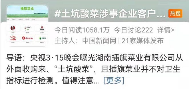 3月15日,康师傅等企业老坛酸菜供应商湖南插旗菜业有限公司被央视“315”晚会点名曝光,引发网友热议。