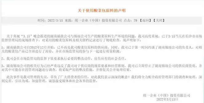 针对央视“315”晚会曝光插旗菜业一事,统一相关负责人对北京商报记者表示,“插旗菜业不是公司供应商,节目中曝光的绿色酸菜包也未供应给统一”。