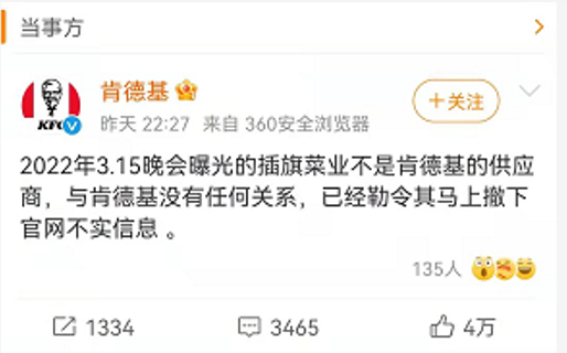 同样,肯德基也在第一时间针对“土坑酸菜”事件发布声明。肯德基方面在声明中表示,2022年“315”晚会曝光的插旗菜业不是肯德基的供应商,与肯德基没有任何关系,已经勒令其马上撤下官网不实信息。