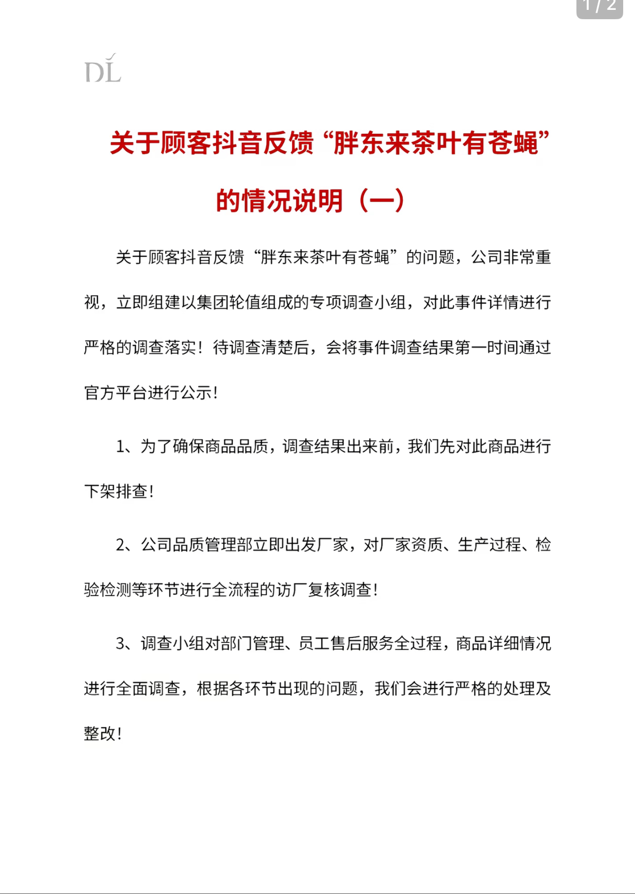 此前,有顾客在抖音平台反馈“胖东来茶叶有苍蝇”。1月5日,胖东来发布情况说明称,公司非常重视,立即组建以集团轮值组成的专项调查小组,对此事件详情进行严格的调查落实。待调查清楚后,会将事件调查结果第一时间通过官方平台进行公示。