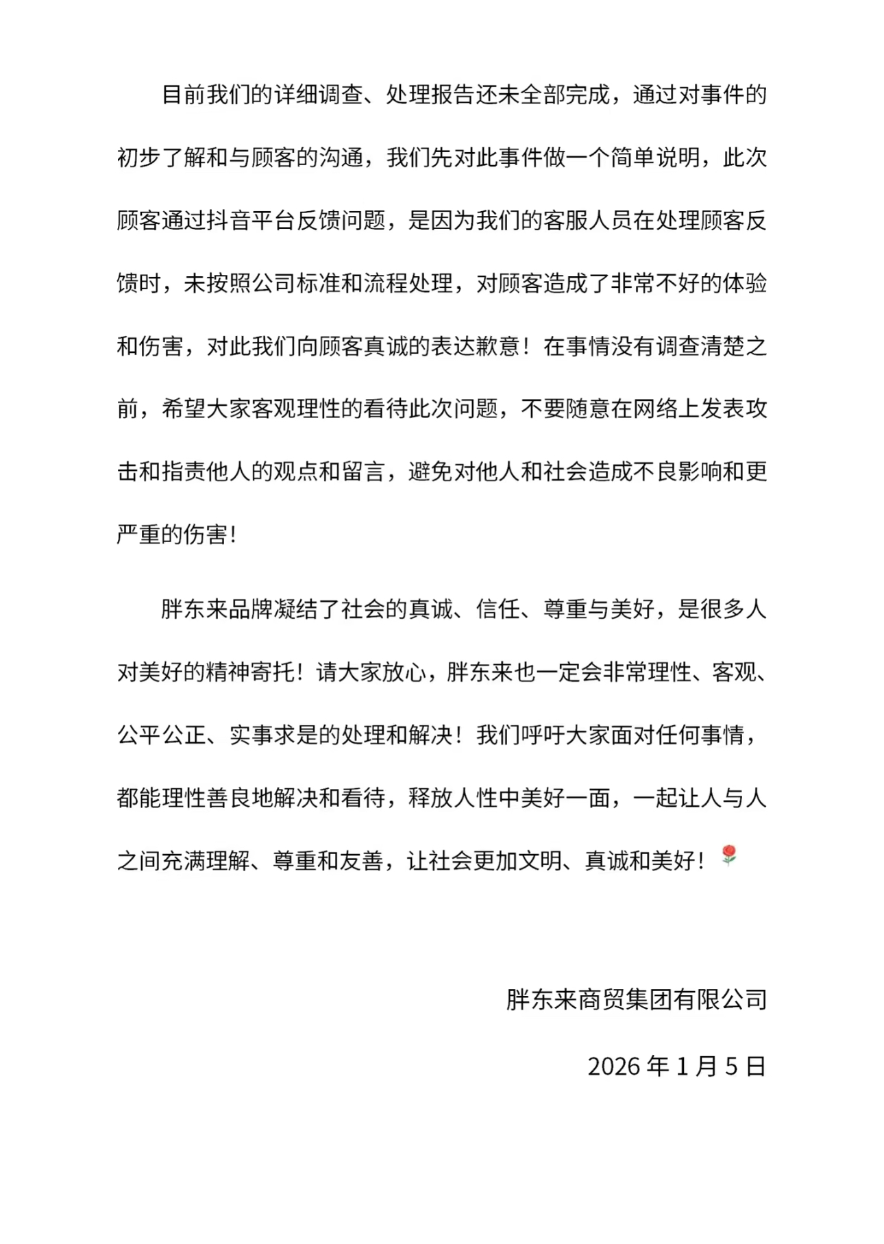 此外,胖东来称,目前详细调查、处理报告还未全部完成,通过对事件的初步了解和与顾客的沟通,先对此事件做一个简单说明。此次顾客通过抖音平台反馈问题,是因为胖东来客服人员在处理顾客反馈时,未按照公司标准和流程处理,对顾客造成了非常不好的体验和伤害,对此向顾客真诚的表达歉意。
