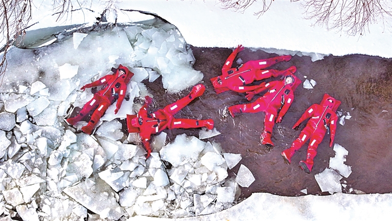 游客在内蒙古境内的吉尔布干河不冻河额尔古纳段体验“冰浮”项目。王正摄/光明图片
