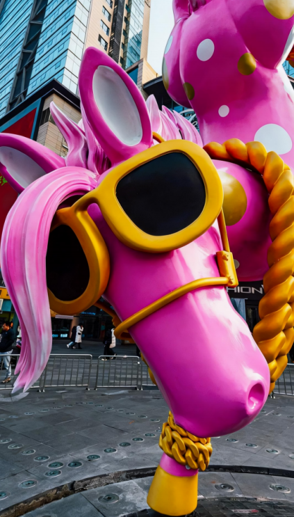 2025年底,山西省太原市北美新天地时尚中心为迎接新年,精心打造了一尊粉色倒立骏马雕塑。