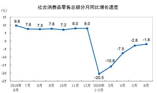 按消费类型分,6月份,商品零售30263亿元,同比下降0.2%,降幅比上月收窄0.6个百分点;餐饮收入3262亿元,下降15.2%,降幅比上月收窄3.7个百分点。1—6月份,商品零售157648亿元,同比下降8.7%;餐饮收入14609亿元,下降32.8%。