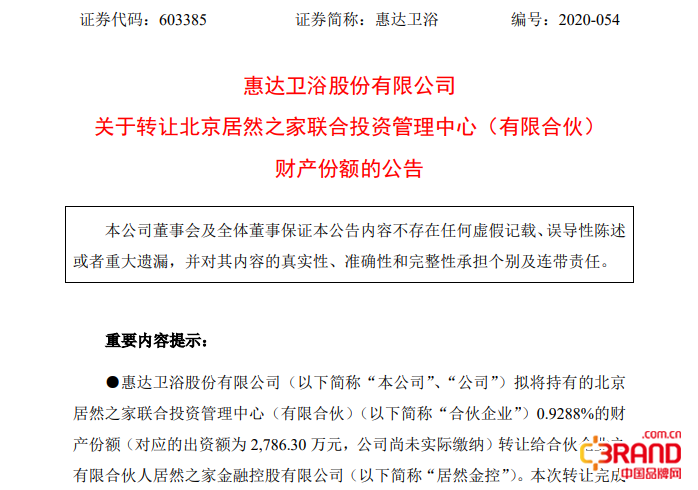 9月7日,惠达卫浴发布公告拟将持有的北京居然之家联合投资管理中心,尚未实际缴纳的2786.30万元财产份额转让给居然金控。公司对本次交易的评价是“将有利于集中资源并降低对外投资风险”。
