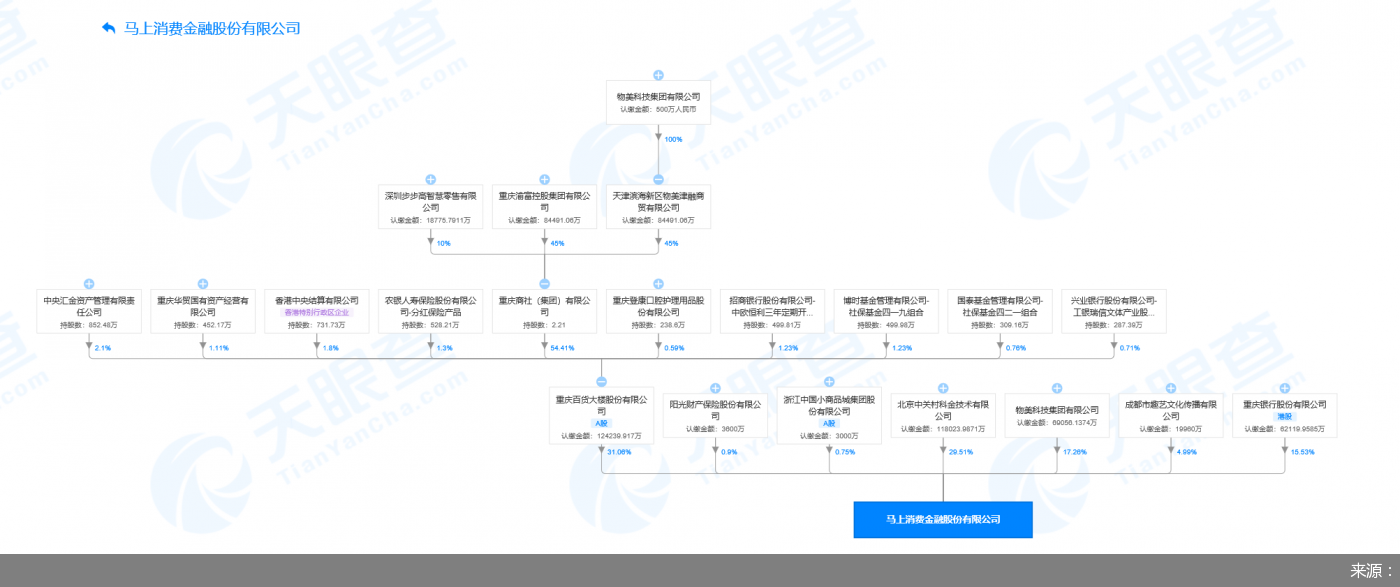 据天眼查APP显示,马上金融第一大股东为重庆百货大楼股份有限公司,持股比例为31.06%;第二大股东为北京中关村科金技术有限公司,持股比例为29.51%;第三大股东为物美科技集团有限公司,持股比例为17.26%。