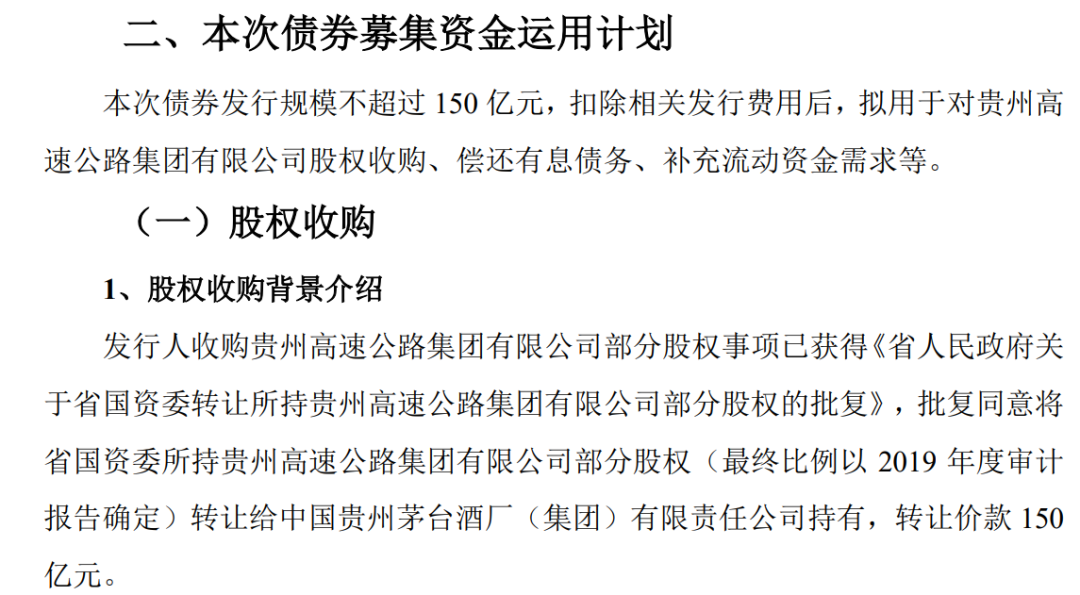 对于此次发行债券的理由,茅台集团在申报稿中表示,拟用于对贵州高速公路集团有限公司(简称“贵州高速”)股权收购、偿还有息债务、补充流动资金需求等。