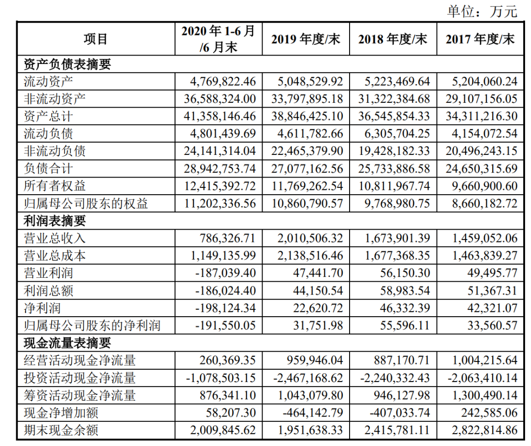 数据显示,2017年-2019年,贵州高速的营收为145.9亿元、167.4亿元、201.1亿元,为之对应的归母净利润3.4亿元、5.6亿元、3.2亿元。2020上半年,该公司由盈转亏,营收仅78.6亿元,归母净利润亏损达19.2亿元。