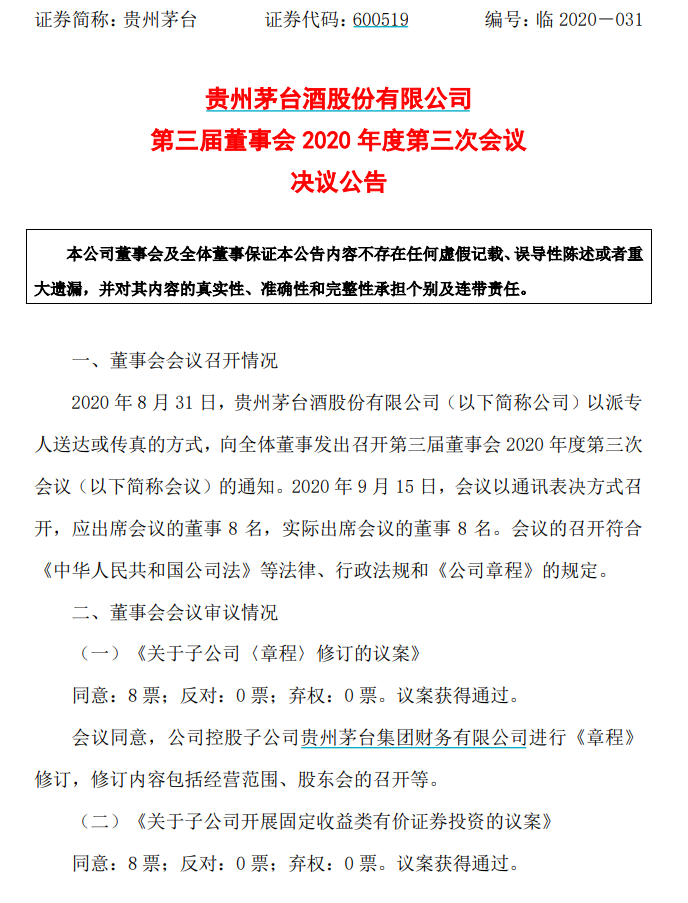 而就在上一日,上市公司贵州茅台酒股份有限公司则发布公告称,公司控股子公司贵州茅台集团财务有限公司开展固定收益类有价证券投资业务,投资总规模不超过其资本总额的70%。