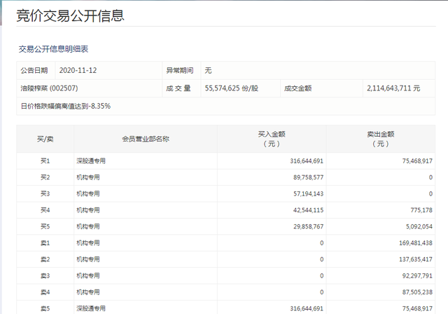 深交所11月12日披露的交易公开信息显示,当天涪陵榨菜成交金额为21.15亿元。8个机构席位出现在龙虎榜单上,四家机构席位合计买入2.13亿元(已经减掉卖出金额),四家机构席位合计卖出4.87亿元。深股通买入3.17亿元,同时卖出7546.89万元。