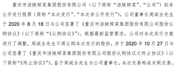 10月29日,公司公告,根据最新监管要求,公司对本次发行方案进行了调整,周斌全不再认购本次发行的股份,并于10月27日与公司签署了《重庆市涪陵榨菜集团股份有限公司股份认购协议之终止协议》。同日,公司披露的非公开发行A股股票预案(修订稿)中提到,本次发行对象中包含涪陵国投。