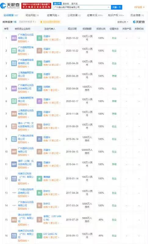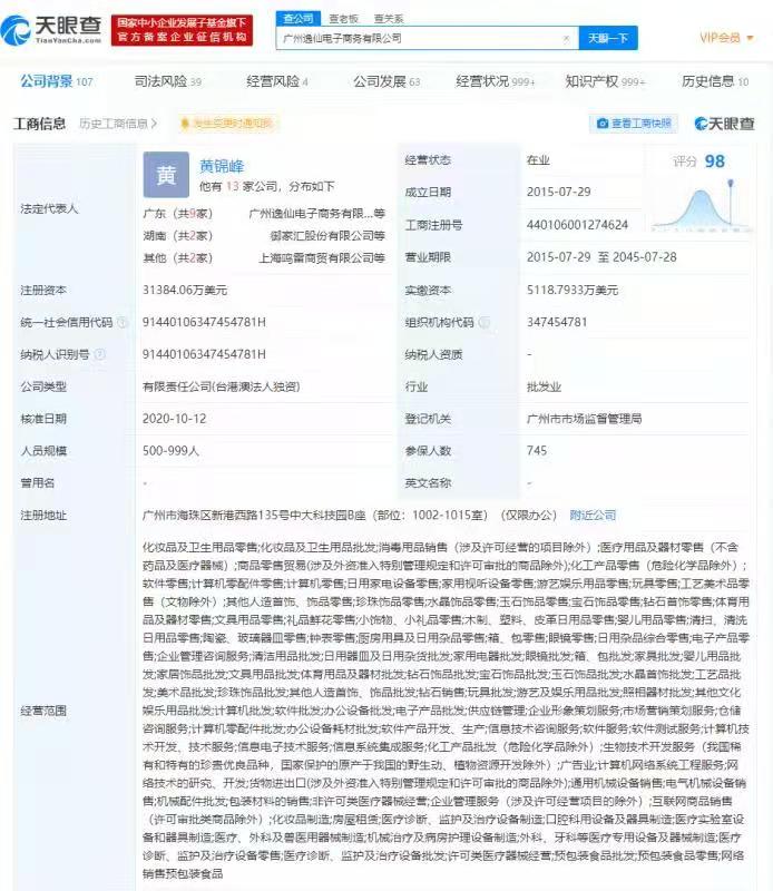 天眼查App显示,广州逸仙电子商务有限公司成立于2015年7月,法定代表人为黄锦峰,公司经营范围包含:化妆品及卫生用品零售;化妆品及卫生用品批发;消毒用品销售;医疗用品及器材零售;商品零售贸易等。目前,该公司有多家对外投资公司,包括广州逸仙宠物用品有限公司、广州逸仙物流有限公司、广州集妍化妆品科技有限公司等。