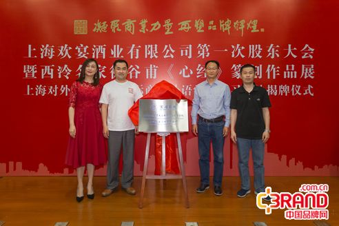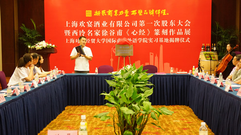 5月19日下午,上海欢宴酒业有限公司第一次股东大会暨西泠名家徐谷甫《心经》篆刻作品展、上海对外经贸大学国际商务外语学院实习基地揭牌仪式,在上海得丘花园酒店举行。