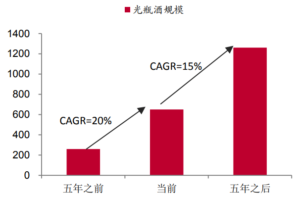 据了解,最近几年光瓶酒平均增速在20%左右,未来几年整个市场容量将突破1200亿元。目前全国主流酒企几乎都推出了自己的光瓶酒产品。牛栏山、玻汾、李渡等更是在全国化推进下持续高成长,以上种种迹象都表明,光瓶酒品类之争已打响。
