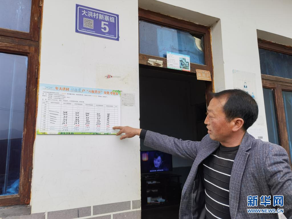 3月12日,贵阳市息烽县石硐镇大洪村村民任福荣指着自家的“六权共享”量化考核表。新华社记者向定杰摄