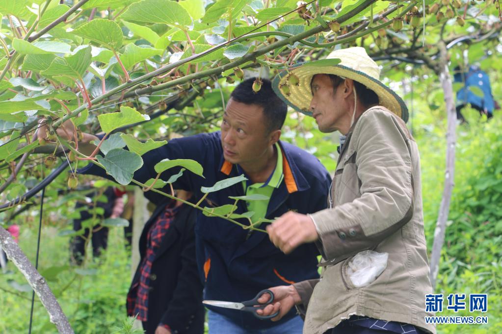 2020年5月28日,技术人员在贵阳市息烽县石硐镇大洪村指导农民管护猕猴桃树。新华社发(刘雪 摄)