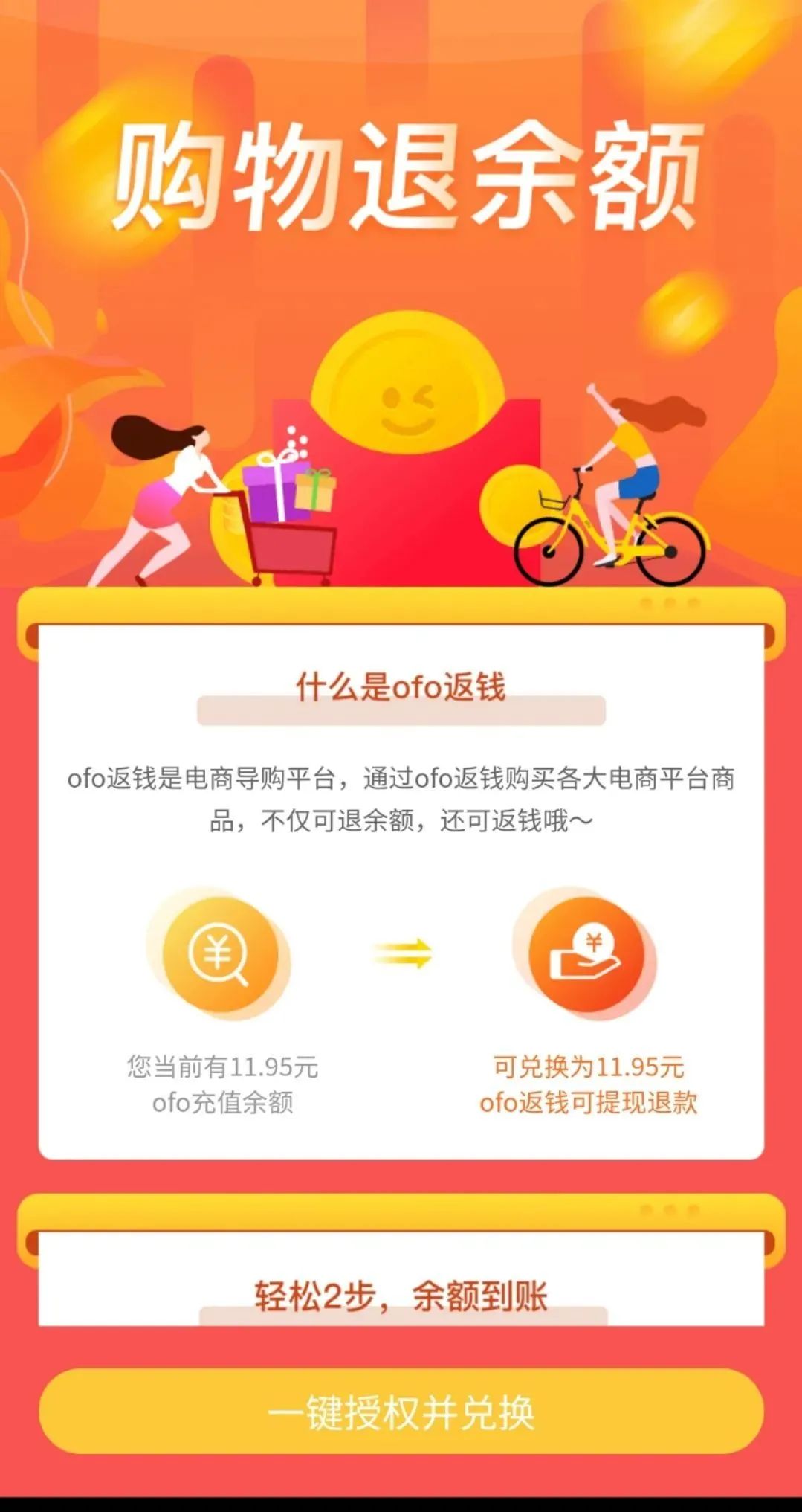该方式本质即通过ofo返钱在第三方平台购物后,ofo返钱以返利等形式奖励给用户,此部分金额在“我的现金”处查看;或通过ofo平台的押金进行等价兑换。