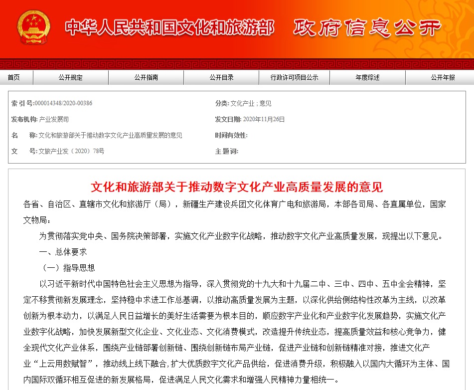 11月26日,文化和旅游部发布《关于推动数字文化产业高质量发展的意见》。意见提出,培育和塑造一批具有鲜明中国文化特色的原创IP,加强IP开发和转化;鼓励数字文化企业参与企业级数字基础设施开放合作;支持“新技术、新业态、新模式”企业发展,扶持中小微数字文化企业成长;支持符合条件的数字文化企业利用多渠道资本市场融资;支持利用数字技术打造夜间文化和旅游产品。