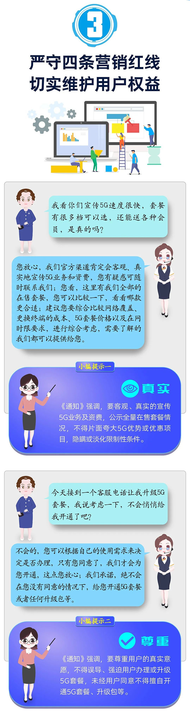 工业和信息化部近日印发通知,部署提升5G服务质量,对各省(区、市)通信管理局、各基础电信企业和中国信息通信研究院提出六项要求:全面提升思想认识,高度重视服务工作;健全四个提醒机制,充分保障用户知情权;严守四条营销红线,切实维护用户权益;统一渠道宣传口径,及时回应社会关切;建立三类监测体系,准确把握服务态势;强化协同监管,加强监督检查。