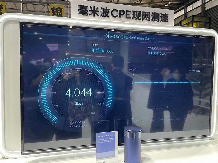 而在展台的另一侧,一台网速测速机器实时测试现场网速。数据显示,毫米波覆盖下,5G网络的峰值达到了4114Gbps,其平均速度也达到了4044Gbps的水平。