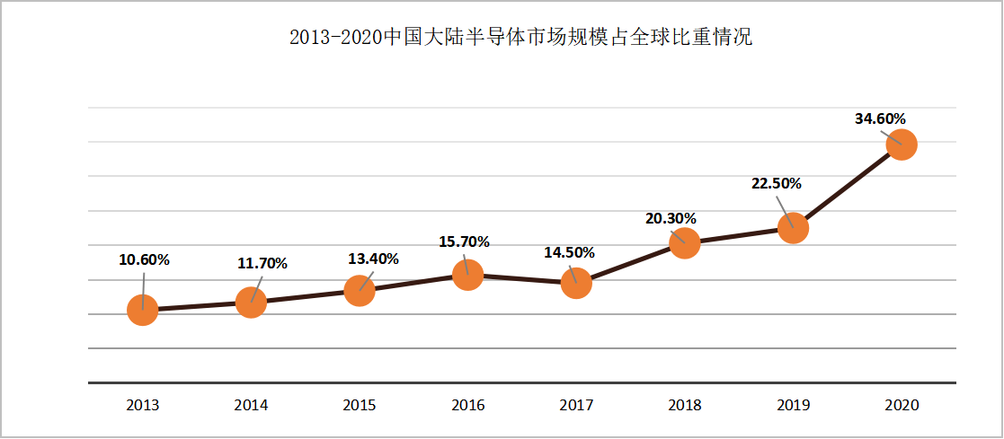 伴随着半导体产品销售额的增长,中国大陆半导体市场规模占全球比重也在稳固上升。至2020年中国大陆半导体市场规模占全球比重已达34.6%。