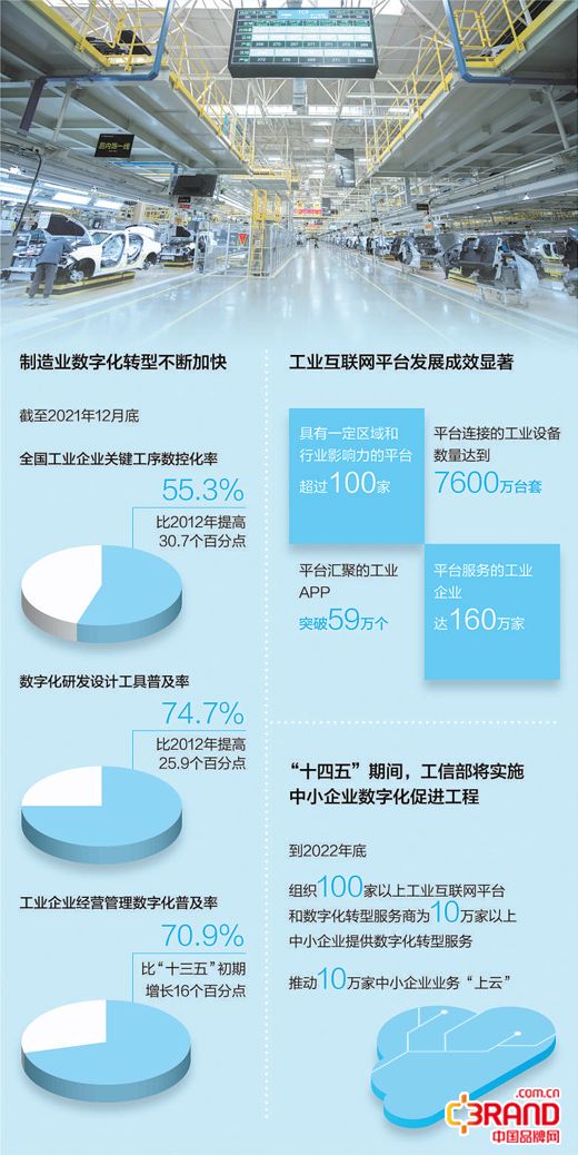 推动传统制造业数字化改造,是我国制造强国建设的重要一环。工信部统计显示,截至2021年12月底,全国工业企业关键工序数控化率、数字化研发设计工具普及率分别达55.3%和74.7%,比2012年分别提高30.7个和25.9个百分点;工业企业经营管理数字化普及率达到70.9%,比“十三五”初期增长16个百分点。