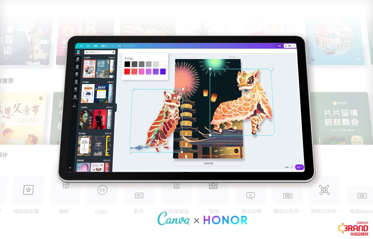 “Canva是一个简单到不需要说明书的产品,只要在荣耀平板V6上打开Canva,就可以看到设计需要的所有原材料:数万张模板、1000种中英文字体、5000万张高清图片、上万的插画,应有尽有。年轻的用户通过简单的拖拽和修改,就可以完成自己的设计作品,既可以创造个性化的墙纸、社交媒体图文,还可以代替专业工具,做出满足商业应用场景的设计。这是传统的Photoshop, InDesign这样的软件无法自由实现的。” Canva中国区CEO张源表示。