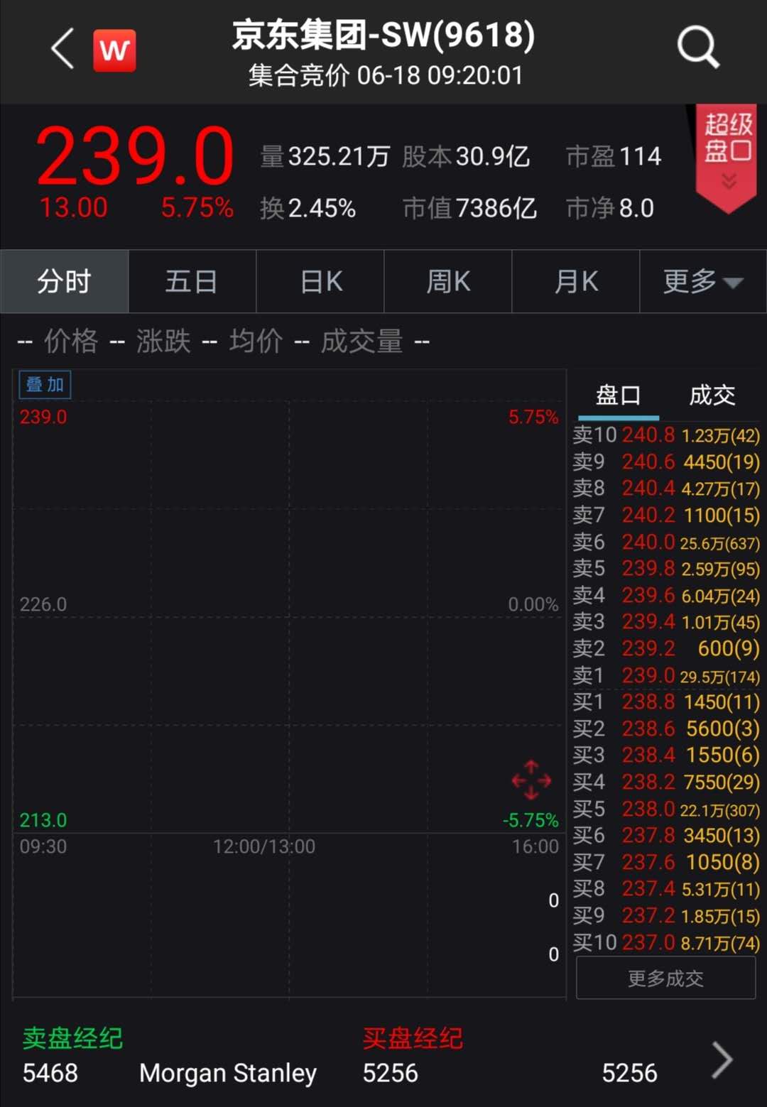 京东今日(18日)在港交所正式挂牌交易,高开5.75%,报239港元/股,此前发行价定为226港元。现总市值为7386亿港元,居港股市场第15位。