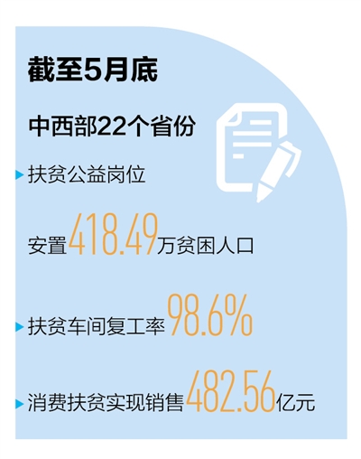 政策给力,截至5月底,25个省份贫困劳动力外出务工已达去年外出务工总数的100.79%,中西部22个省份扶贫公益岗位安置418.49万贫困人口,扶贫车间复工率98.6%,消费扶贫已实现销售482.56亿元。