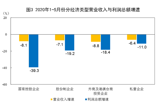 1—5月份,规模以上工业企业中,国有控股企业实现利润总额4404.2亿元,同比下降39.3%;股份制企业实现利润总额13478.8亿元,下降19.2%;外商及港澳台商投资企业实现利润总额4659.2亿元,下降18.4%;私营企业实现利润总额5607.3亿元,下降11.0%。