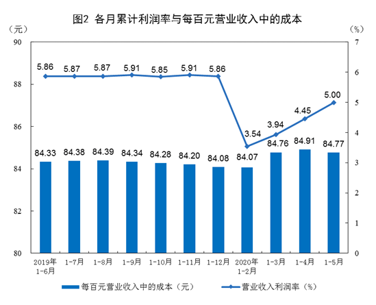 1—5月份,规模以上工业企业每百元营业收入中的成本为84.77元,同比增加0.58元;每百元营业收入中的费用为9.05元,同比增加0.26元。