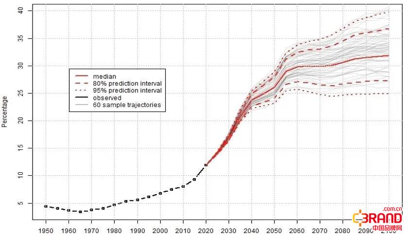 中国65岁以上老年人口百分比。图片来源:联合国2019年世界人口展望报告