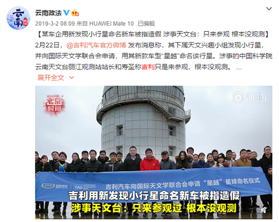中国科学院云南天文台丽江观测站很快“辟谣”,并发布消息称,“吉利公司员工只是去参观和做科普活动,并没有参与任何观测小行星的项目”。如此看来,用星越命名小行星之事实属无稽之谈。