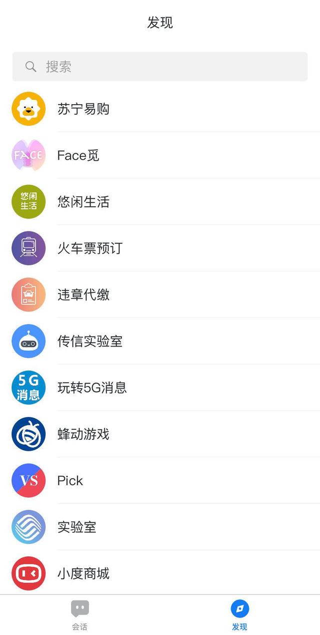 5G消息App有“会话”和“发现”两个分类板块,其中在“发现”内,排列着一些日常所需的服务,包括“苏宁易购”、“火车票预订”、“违章代缴”等。