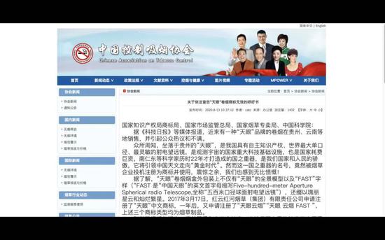 针对“天眼”被烟草企业注册商标并使用一事,中国控制吸烟协会8月13日在其官网发布声明,希望国家知识产权局商标局等部门对此事予以关注。